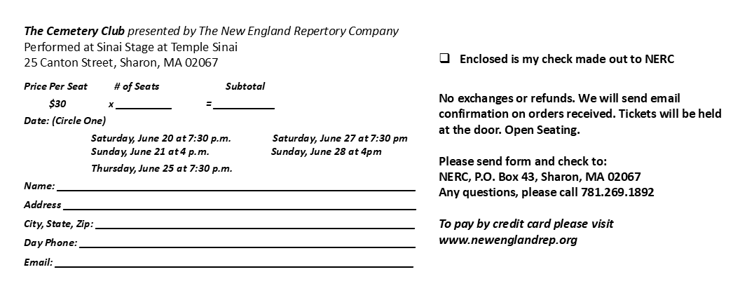 New England Repertory Company proudly presents The Cemetery Club June 20-28, 2026 at Sinai Stage in Sharon, MA.